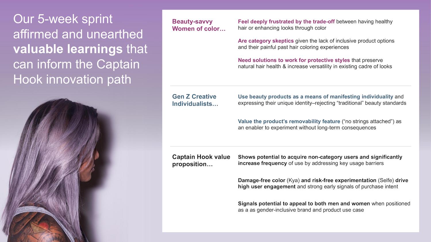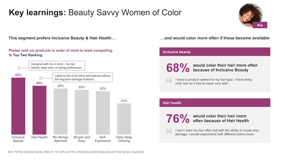 Some of the key learnings from the quantitative survey were that Women of Color preferred inclusive beauty and hair health, while Gen Z consumers were more interested in no strings attached in addition to healthy hair.