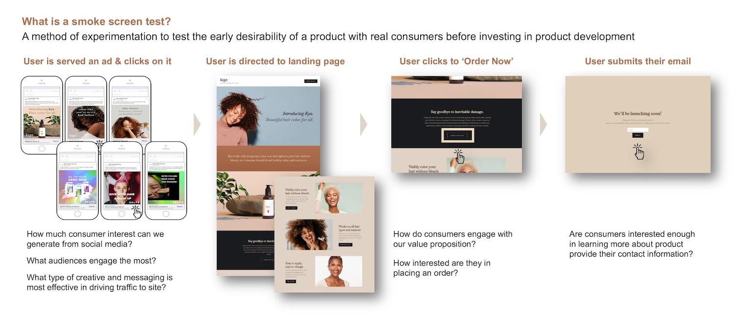 A smoke screen test is a method of experimentation to test the early desirability of a product with real consumers before investing in product development. We conducted these tests through social media ads, directing users to our landing page and tracking how consumers interacted with the brand. If a person was interested in the product, they could provide their email address to learn more.