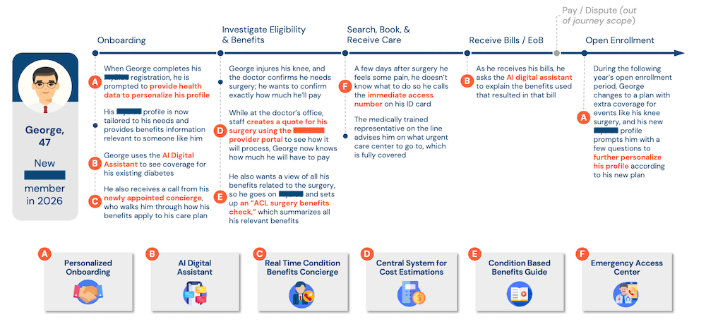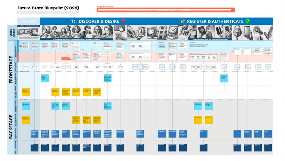 Even after the blueprinting sessions, we continued to refine and validate the frontstage and backstage feasibility with expert calls. The initial version with stickies soon turned into a structured digital visual: I designed the final blueprints - which identified key member actions, touch points, company actions, third party actions, support processes, and technology that would enable the ideal future-state journey.