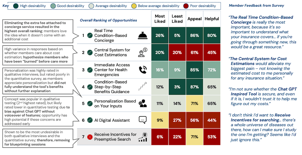 At the end of the three-hour ideation session, the participants came up with tons of great ideas - which were further synthesized to create concept cards. These concept cards (or 'opportunity canvases') were thoughtfully developed to use for user testing and expert interviews. We launched a quantitative survey as well as conduct one-on-one user interviews to see if the opportunities were desirable to customers. Then we spoke with subject matter experts to see if the opportunities were feasible, from a technical and operational lens.